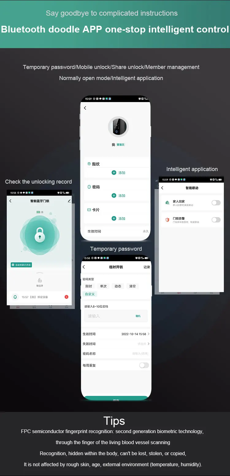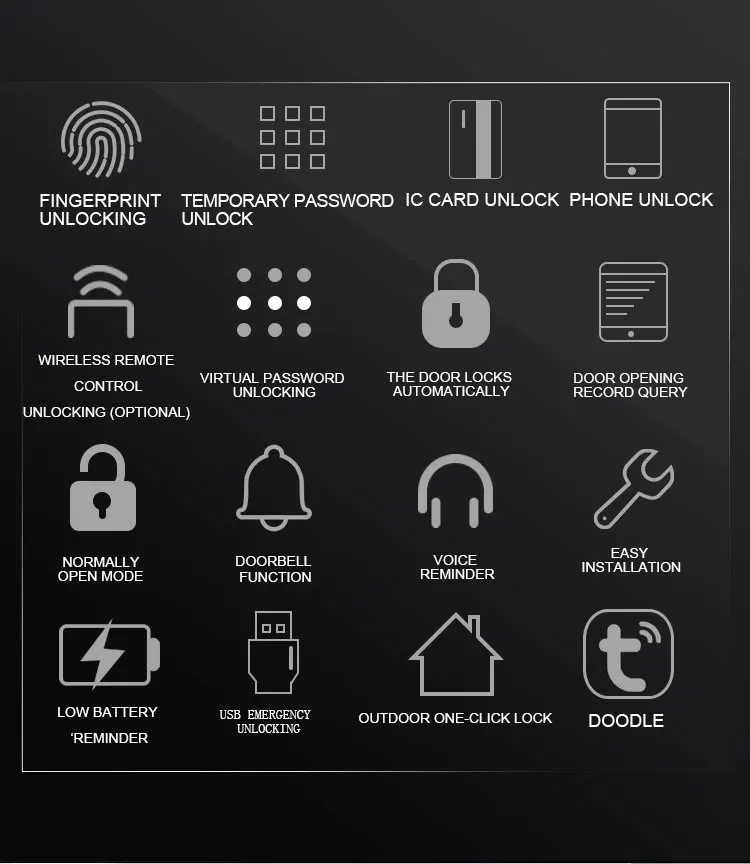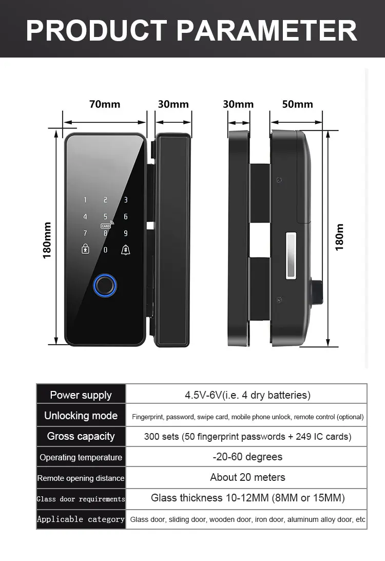 Function | Fingerprint+Password+IC card+Mechanical key+Tuya App+NFC |