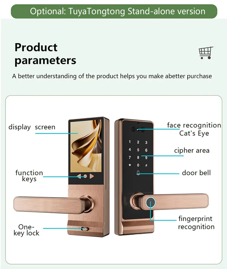 Function | 3D Face recogition Fingerprint Password IC Card total user capacity(300pcs) App(tt lock/tuya wifi) Mechanical Key(2pcs) |