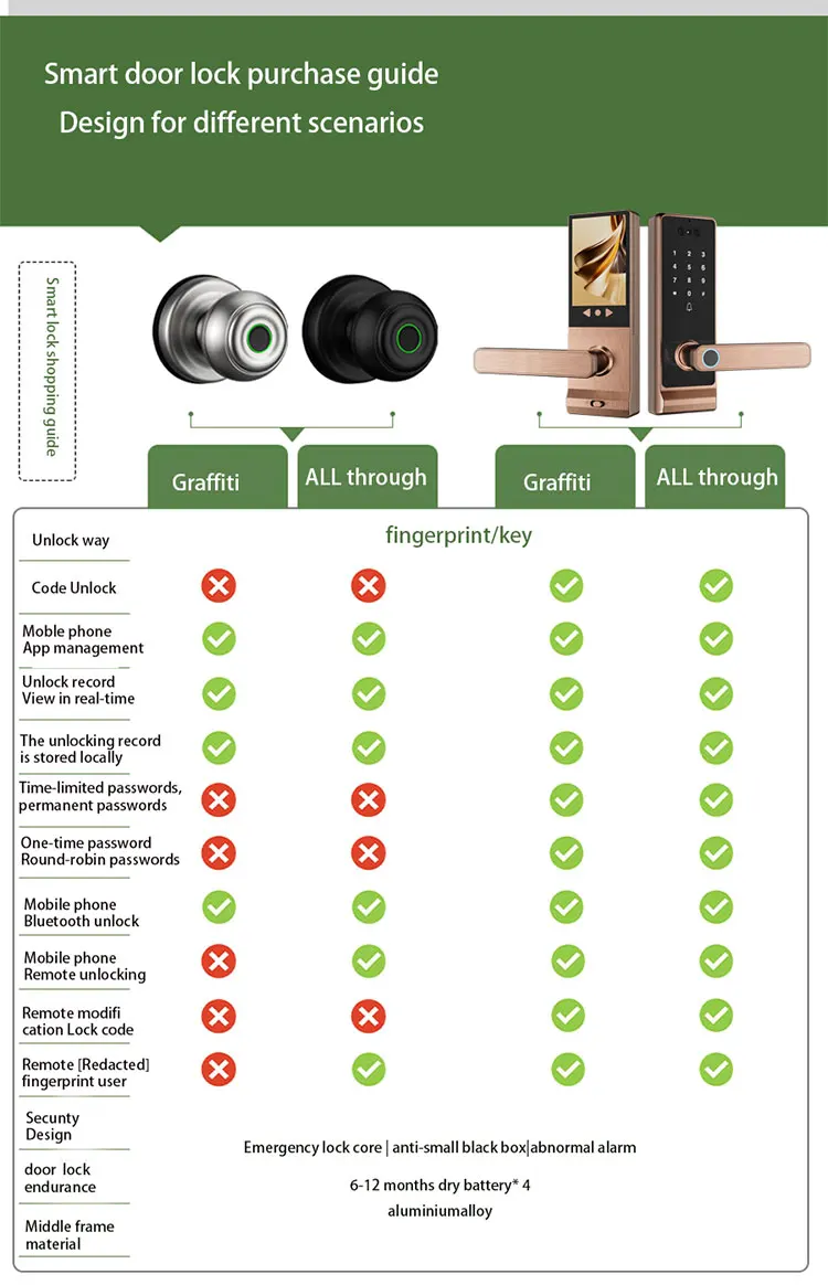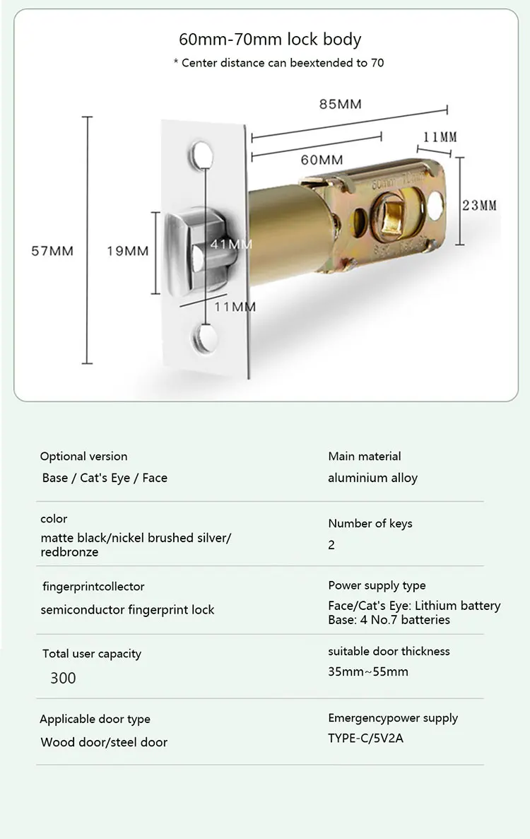 Product Description | Power supply: 4pcs AAA batteries Static current: ≤35uA Working current: ≤180mA Operating temperature range: -20~60℃ Bluetooth standards: Blutooth 5.0 BLE Fake admission rate: ≤ 0.00004% Authenticity: ≤ 0.015% Door thickness:35–50mm |