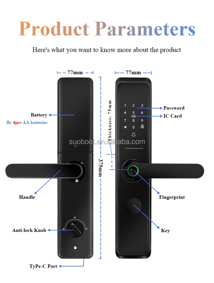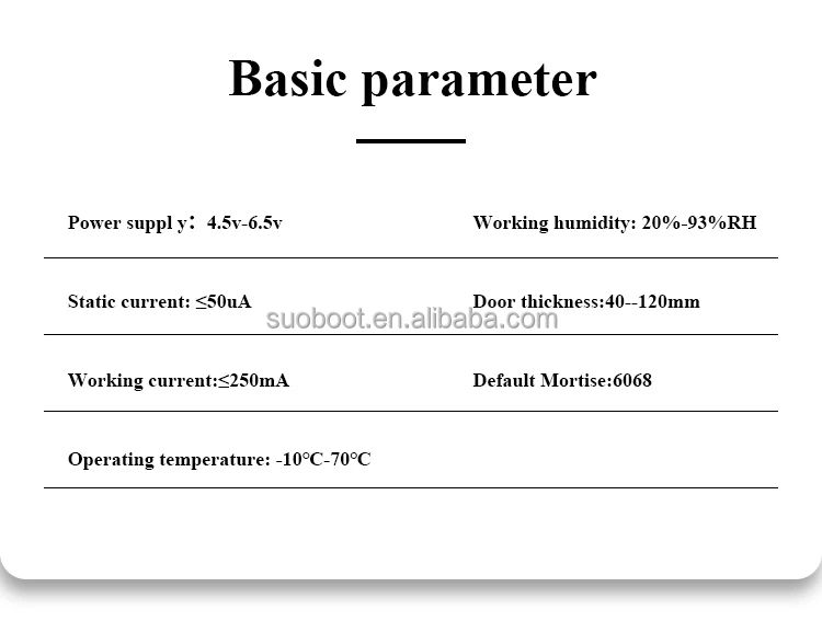 Product Description | Power suppl y:4.5v-6.5v (4pcs AA batteries) Static current: ≤50uA Working current:≤250mA Operating temperature: -10℃-70℃ Working humidity: 20%-93%RH Door thickness:40–120mm |