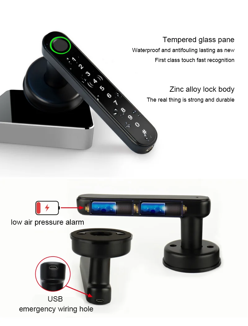 Product Description | Power supply:6v (4pcs AA batteries) Working current:≤200mA Operating temperature: -20℃-60℃ Working humidity: 10%-90%RH Door thickness:35–80mm |