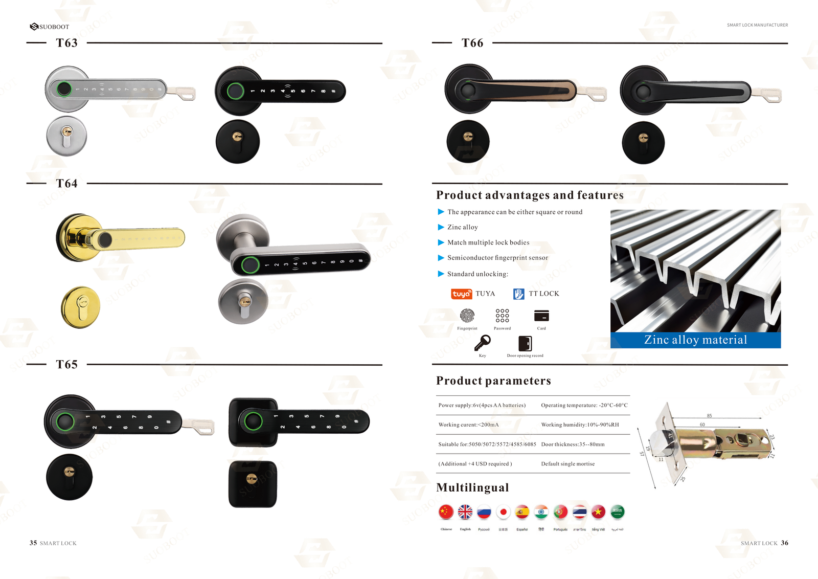 适用于木/钢/铝门的SUOBOOT T63-U云存储卡生物指纹密码无钥匙智能门锁